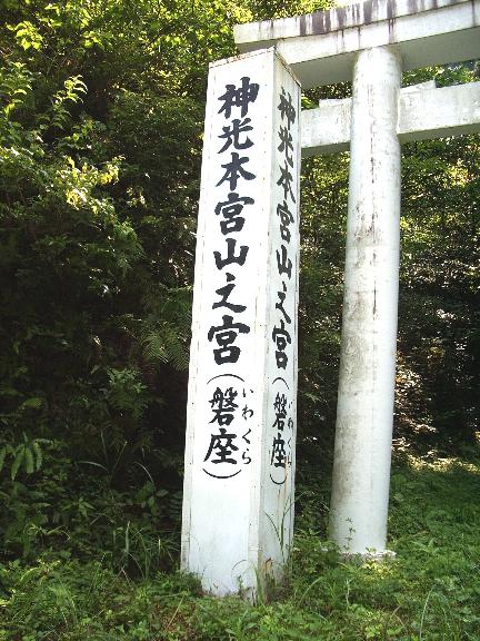その途中道のそばの林の中にコンクリ製の鳥居を発見。鳥居わきにでっかい石柱があって、そこに「神光本宮山之宮(磐座)」と書かれています。「磐座」にはわざわざ「いわくら」とふりがなが振ってありました。